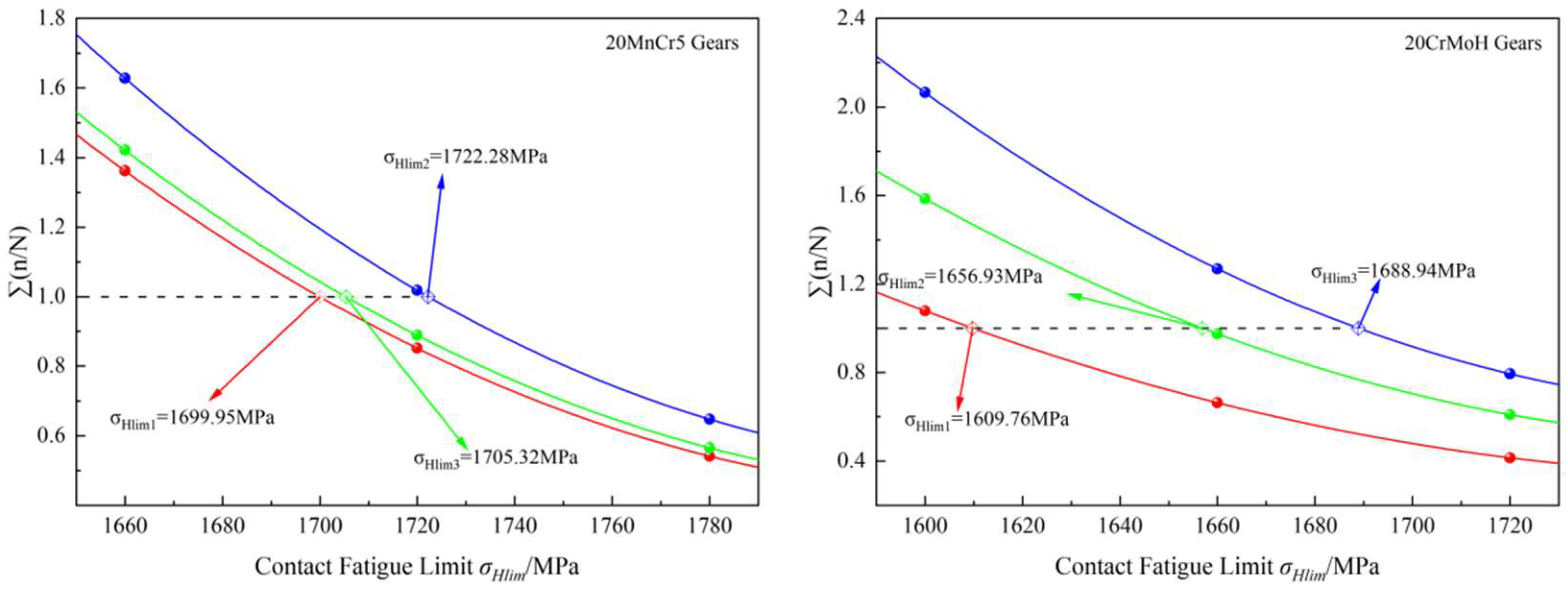 σHlim is less than 3%. Crucially, regardless of the m value selected within this range, the relative performance ranking remains unchanged, with 20MnCr5 consistently exhibiting superior fatigue resistance compared to 20CrMoH. Thus, the standard value of 13.22 provides a robust and comparative basis for this study. Furthermore, potential calculation bias from tooth-to-tooth stress variability is minimized by the pre-test running-in process and the high-cycle averaging nature of the protocol (3.0 × 10