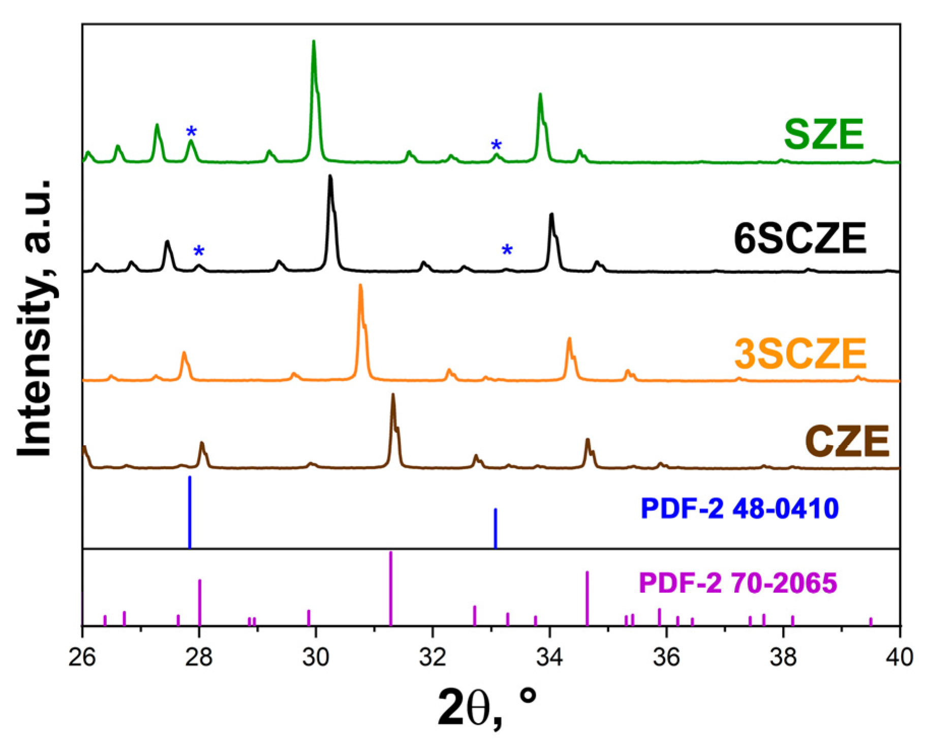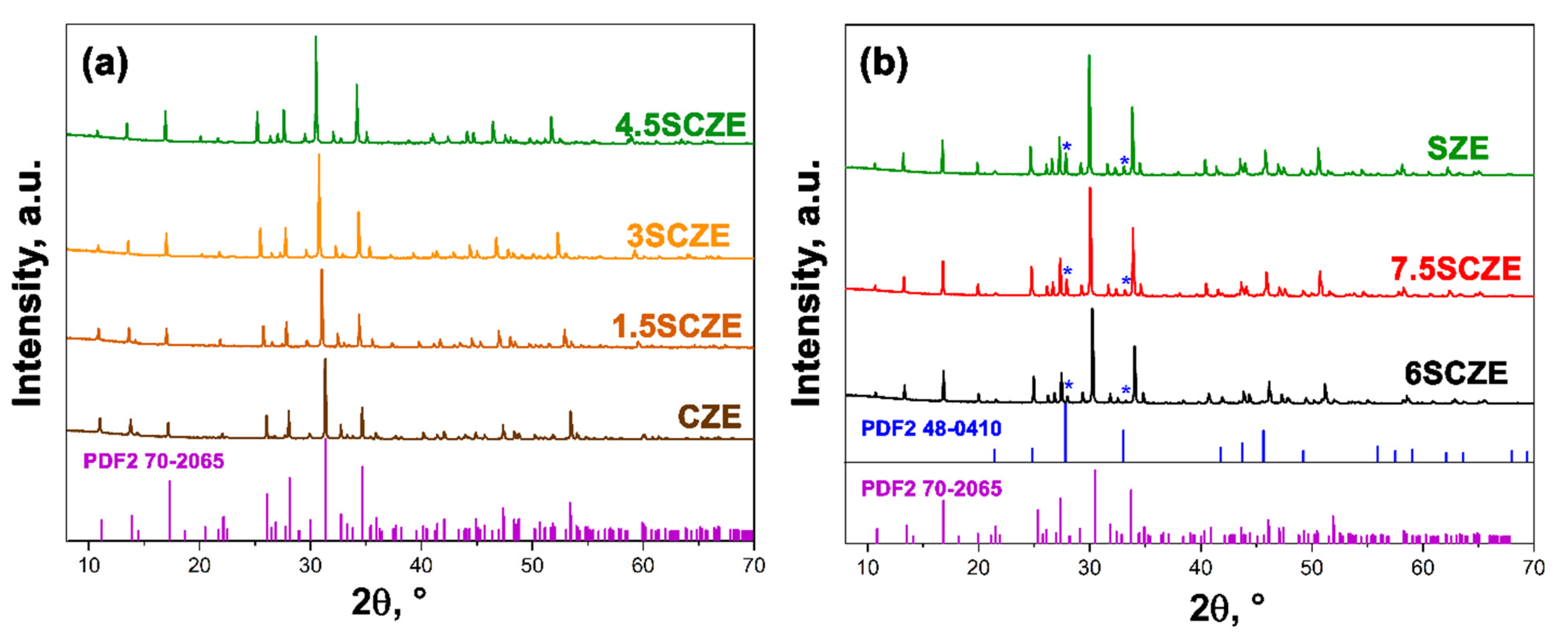 - Deyneko, D.V.; Lebedev, V.N.; Aksenov, S.M.; Shendrik, R.Y.; Pankratov, V.; Lazoryak, B.I.; Gosteva, A.N.; Barbaro, K.; Rau, J.V. Zn2+, Sr2+, and Sm3+ Tri-Doped Whitlockites: Luminescent Materials with Improved Bioactive and Antibacterial Properties. Ceram. Int. 2025, 51, 21117–21134. [Google Scholar] [CrossRef]