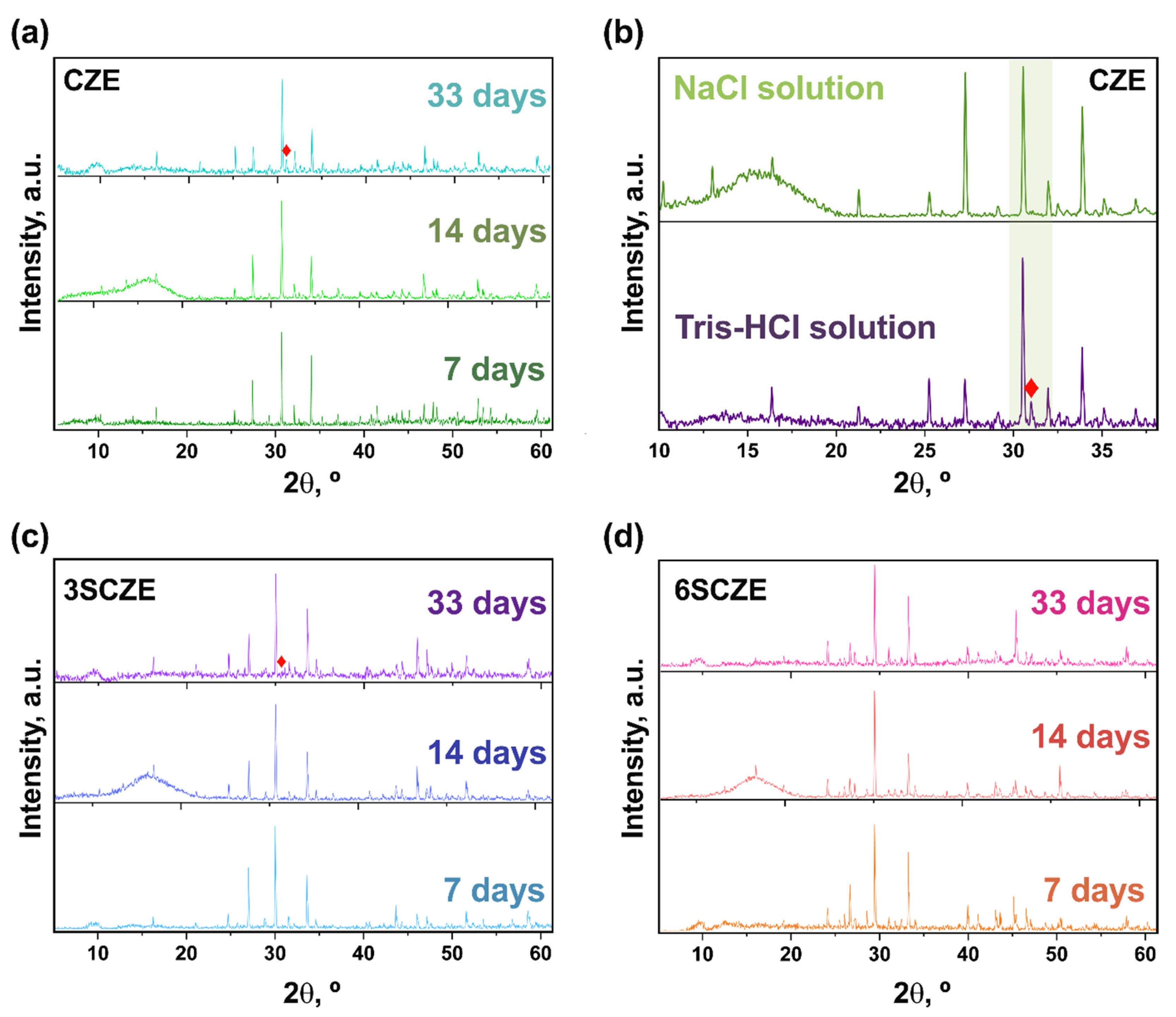 - Sinusaite, L.; Kareiva, A.; Zarkov, A. Thermally Induced Crystallization and Phase Evolution of Amorphous Calcium Phosphate Substituted with Divalent Cations Having Different Sizes. Cryst. Growth Des. 2021, 2, 1242–1248. [Google Scholar] [CrossRef]