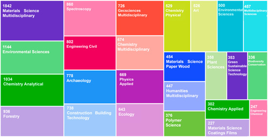 A total of 10,925 citing articles regarding the degradation and protection of wooden cultural relics were identified in the Web of Science Core Collection. Figure 4 displays the top 25 citing articles for research fields on the degradation and protection of wooden cultural relics. Based on statistics from the Web of Science Core Collection, the top 10 research fields in terms of the number of citing articles on the degradation and protection of wooden cultural relics were Materials Science Multidisciplinary, Environmental Sciences, Chemistry Analytical, Forestry, Spectroscopy, Engineering Civil, Archeology, Construction Building Technology, Geosciences Multidisciplinary, and Chemistry Multidisciplinary. The first field is Materials Science Multidisciplinary with 1842 citing articles, the second field is Environmental Sciences with 1144 citing articles, the third field is Chemistry Analytical with 1034 citing articles, the fourth field is Forestry with 936 citing articles, the fifth field is Spectroscopy with 860 citing articles.