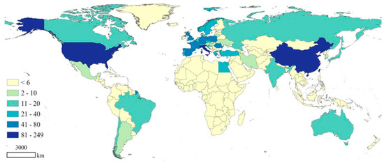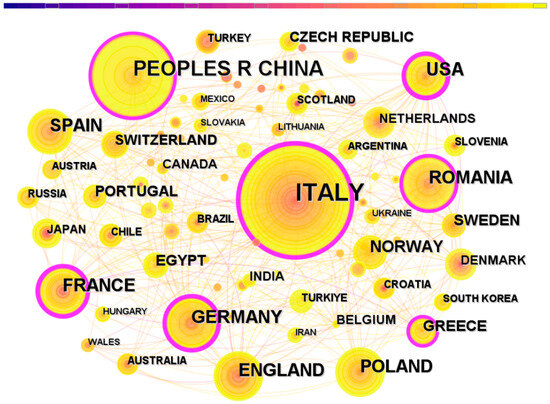 An analysis of the country distribution of publications on wooden cultural relics degradation and protection was conducted based on the aforementioned literature search. Figure 5 displays the contribution of different countries in degradation and protection of wooden cultural relics research. Figure 6 displays the network visualization among different countries (regions) that have published at least 6 papers on the degradation and protection of wooden cultural relics. The font size and circle area size represent the number of published papers while the circle area colors indicate the year, and the link lines among different countries (regions) indicate the collaboration activity. The top 10 countries (regions) that have published papers on the degradation and protection of wooden cultural relics were Italy, China, the USA, Romania, Germany, England, France, Poland, Spain, and Norway. Italy leads in the number of publications, with 249 papers on the degradation and protection of wooden cultural relics, while the second country was China with 147 papers. In addition, Italy, the USA, France, Germany, and China have many international collaborations with other countries or regions. This trend indicates a move towards increased international cooperation in the research on wooden cultural relic degradation and protection.