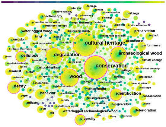 Figure 8 displays the network visualization among different keywords that have appeared in at least 5 papers on the degradation and protection of wooden cultural relics. From 1987 to 2025, the top 10 keywords were cultural heritage, conservation, wood, degradation, archaeological wood, decay, identification, cellulose, diversity, behavior. The word “cultural heritage” appears 136 times, “conservation” appears 125 times, “wood” appears 83 times, “degradation” appears 75 times, and “archaeological wood” appears 57 times, which means they are still the research hotspots. Among them, keywords such as conservation, wood, diversity, cultural heritage, degradation, archaeological wood, identification, and cellulose exhibit strong centrality, indicating that these keywords have significant research influence and that their related thematic studies have a broader reach. Particularly, research related to keywords such as conservation, wood, diversity, and cultural heritage constitutes the central theme of wooden cultural relic degradation and protection.