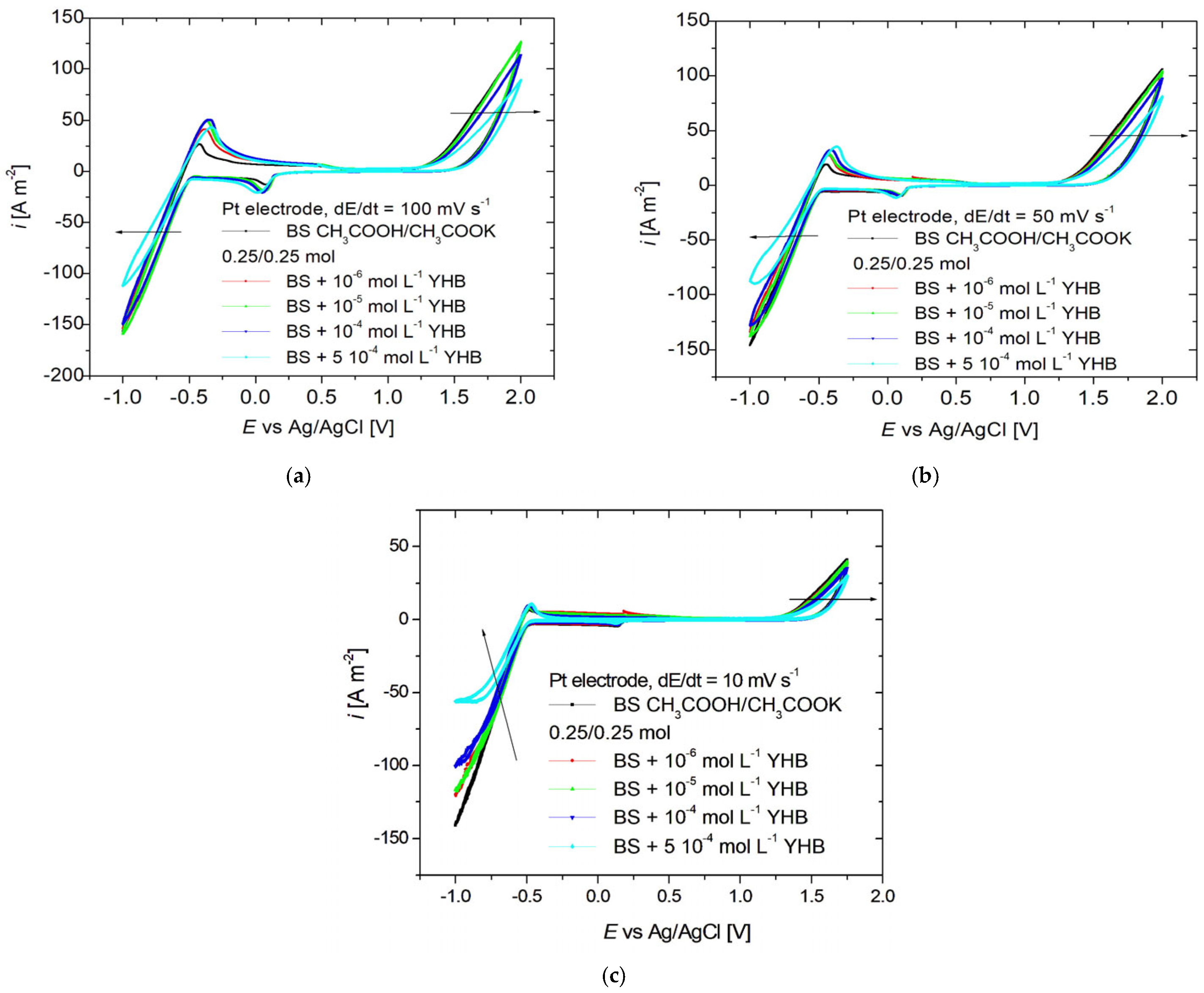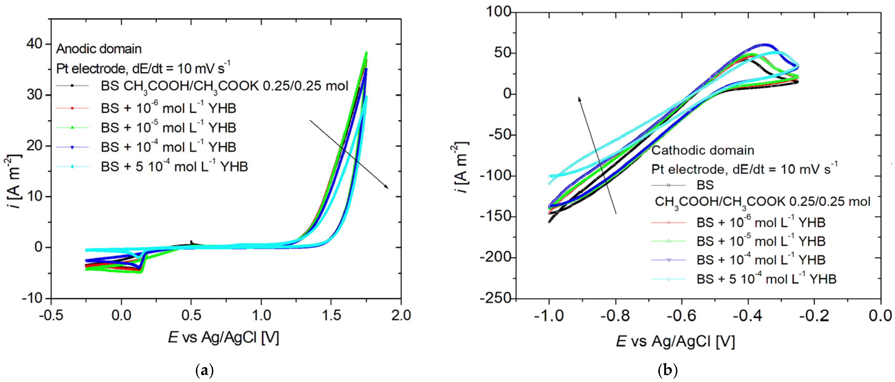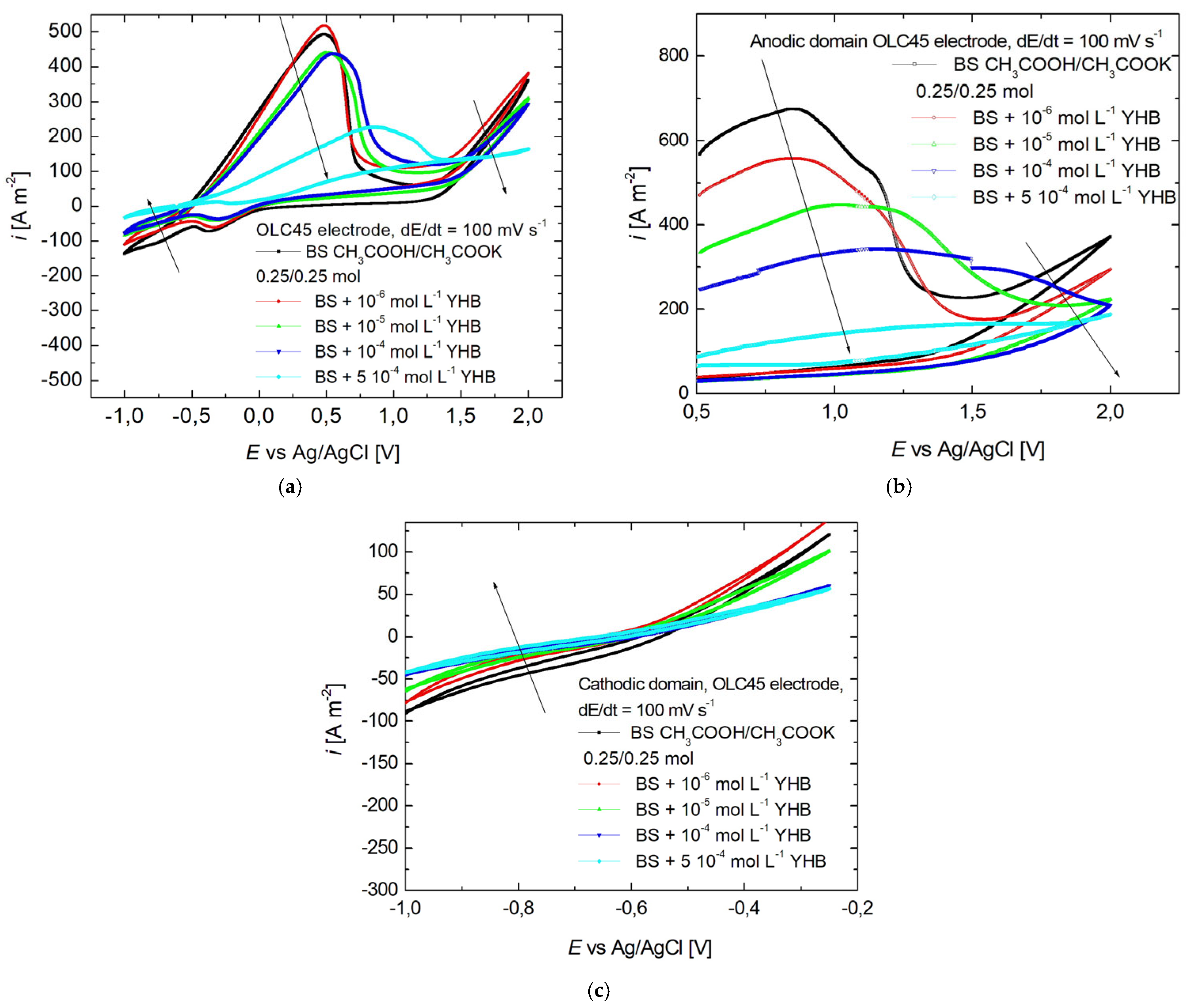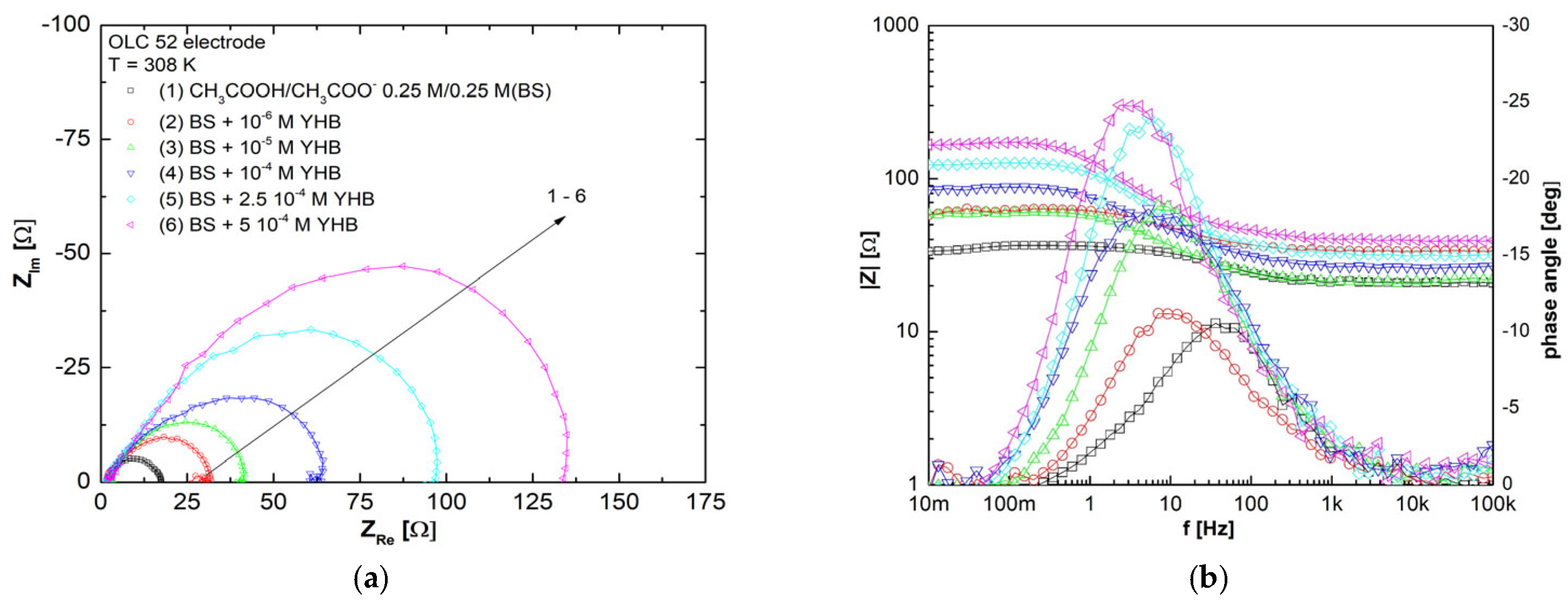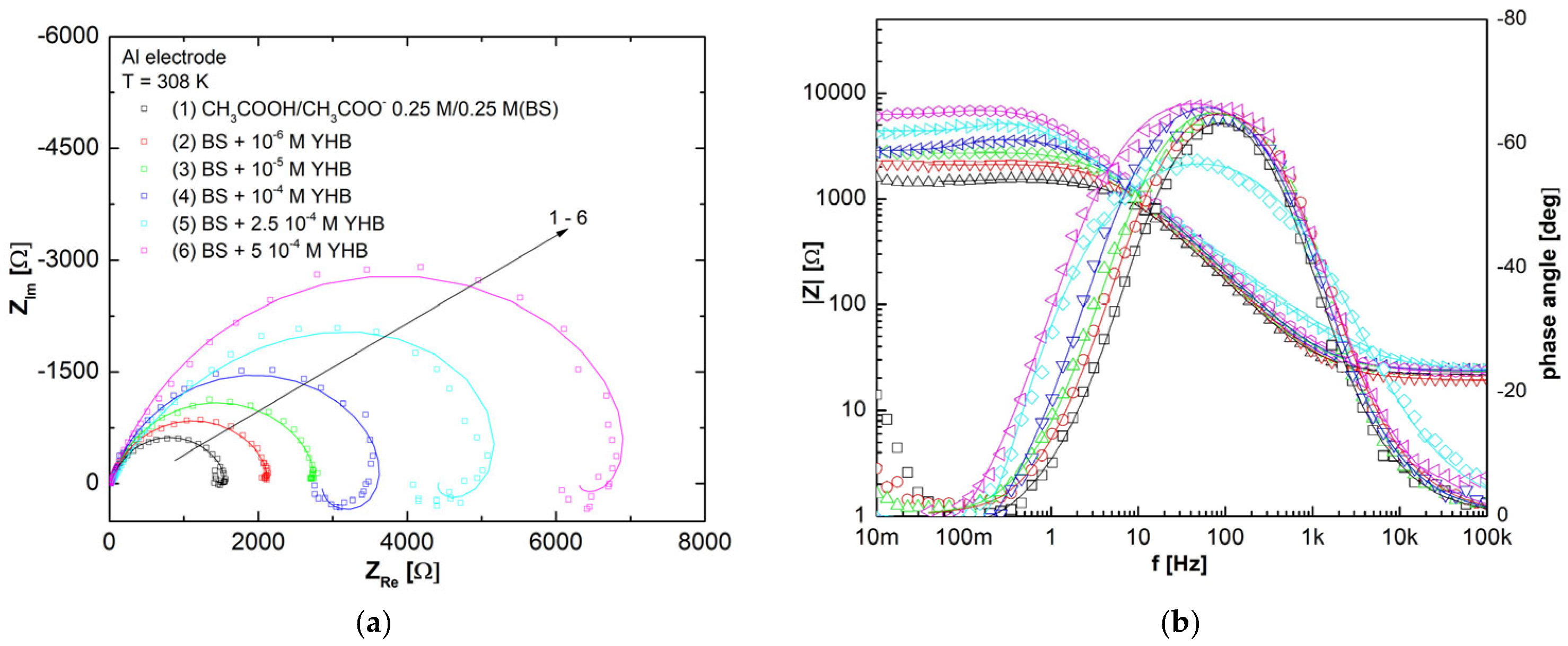 | YHB Conc. (M) | RS (Ω) | CPE-T (F cm−2 sn−1) · 105 | n | Rct (Ω cm2) | χ2 | L (L cm2) | RL (Ω cm2) | Cdl·106 (µF cm−2) | E (%) | θ |