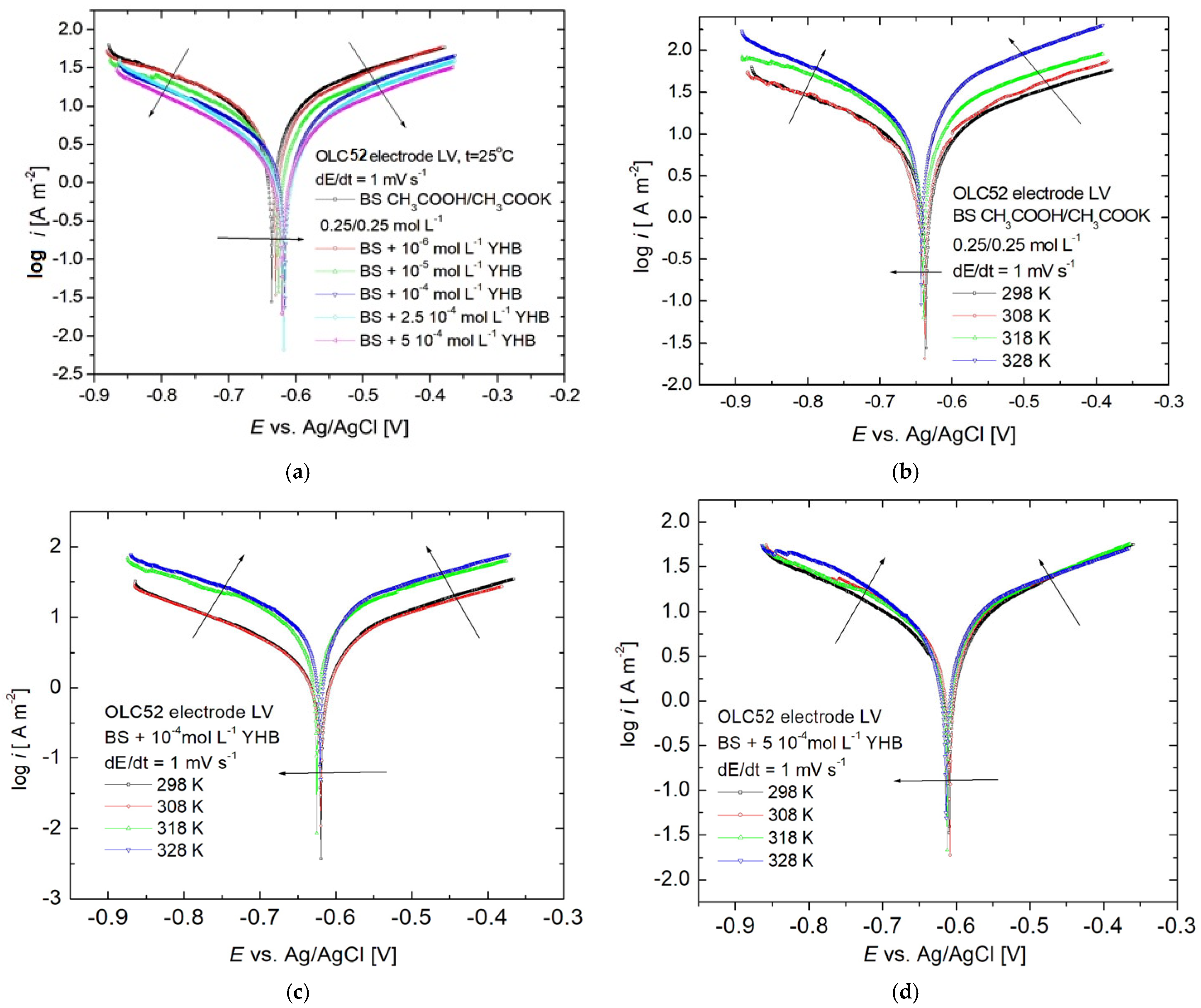 | Metal | T [K] | YHB conc. | icorr | Ecorr | -bc | ba | vcorr | IE | θ |