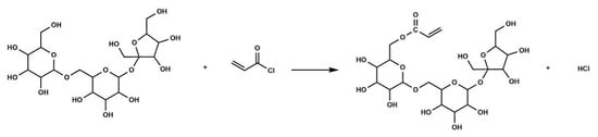Raffinose (7.6 g) and TEA (3.0 g) were dissolved in DMF (200 mL) at ambient temperature to obtain solution A. Subsequently, AC (4.6 g) in 100 mL DMF was slowly added to solution A within 3 h with an ice water bath under vigorous stirring, followed by further reacting for 6 h at 25 °C. Then, filtration and vacuum distillation were applied to the obtained mixture to remove TEA and DMF. After that, the purified product was added to 150 mL of ice-cooled ethyl ether under vigorous stirring in a dropwise manner. Finally, the obtained yellow viscous liquid was rinsed with ether several times and then dried in a vacuum oven. The dried intermediate was sealed and stored for further use. The schematic diagram of the reaction process is shown in Figure 2.
