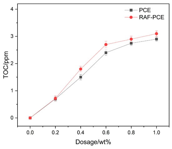 The adsorption capacity of polycarboxylate superplasticizers on cement particles directly determines their dispersion performance, as higher adsorption typically leads to stronger electrostatic repulsion and steric hindrance, thereby improving cement paste fluidity. The adsorption capacity of PCE of cement particles was explored by the TOC analyzer. As exhibited in Figure 6, the adsorbed amounts of PCE and RAF-PCE increase linearly as a function of water-reducing agent dosage at the initial stage. This is due to the deposition of hydration products on the surface of the cement particle, which decreases the number of water reducer molecules in solution. As the water-reducing agent dosage exceeds 0.6 mg/g, the adsorption amount of PCE and RAF-PCE tends to be stable. It is noted that the adsorption capacity of the RAF-PCE is higher than that of the PCE. This was attributed to the stronger adsorption of hydroxyl groups in the RAF-PCE for cement grains.