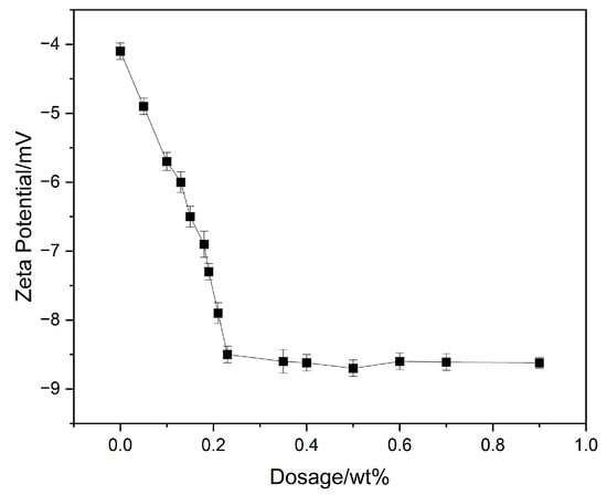 The zeta-potential of cement particles in the presence of polycarboxylate superplasticizers reflects their surface charge status; a more negative zeta-potential indicates stronger electrostatic repulsion between particles, helping prevent aggregation and improve dispersion. To study the influence of RAF-PCE on cementitious systems, the zeta-potential of cement paste with various water reducer dosages was measured. Here, the surface charge property of the cement particle is highly dependent on the anionic groups of the modified water reducer. As indicated in Figure 7, the zeta-potential decreases with the increase in RAF-PCE content when the dosages of superplasticizer are less than 0.2%. This was caused by the adsorption of negative ionization groups on the surface of the cement particle. Once the relevant dosages exceed 0.2%, the surface of cement particles is saturated by superplasticizer; hence, the relevant zeta-potential reaches the plateau region (~8.5 mV), implying the superior adsorption ability of superplasticizer and excellent flowability of cement slurry [32,33].
