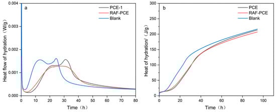 Hydration heat is a critical indicator of cement hydration kinetics which directly reflects the timing of hydration exothermic peaks (induction period, acceleration period), the intensity of heat release, and the total heat generated, all of which are closely linked to cement setting time, early strength development, and potential thermal cracking in mass concrete. To systematically investigate the effect of water reducer on the hydration process, the heat flow and heat release were evaluated using a multi-channel isothermal calorimeter. Compared with the blank sample, the hydration exothermic peak of cement pastes with RAF-PCE and PCE reflects different degrees of delay (Figure 8a), indicating that the addition of superplasticizer can prolong the hydration of cement. Interestingly, the hydration heat of cement pastes containing RAF-PCE exhibits a lower and wider peak than that of PCE. The above results are probably attributed to the increase in adhesion of polymer molecules and the dense hydrates generated on the surface of the cement particles, which effectively impede the dissolution rate and delay cement hydration. In addition, the anion functional group of the water reducer could complex with Ca2+ in the cement, and therefore suppresses the nucleation and growth of the hydration mineral [34,35,36], which prolongs the induction period of the cement hydration. Figure 8b is the hydration heat release curve. As indicated, the cement pastes with RAF-PCE exhibit the smallest hydration heat release, which is consistent with the law of hydration heat flow.