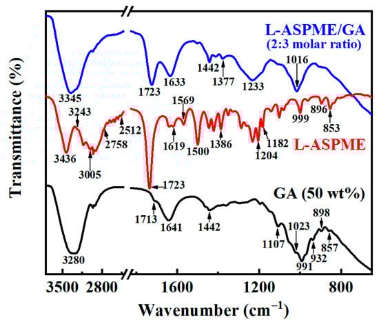 FTIR spectra of neat L-ASPME, the 50 wt% GA solution, and the L-ASPME/GA hybrid precipitate (2:3 molar ratio) formed on Q235B steel.