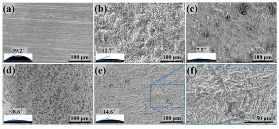 SEM images of Q235B steel surfaces: (a) before pickling and (b–f) after immersion in 0.5 M H2SO4 solution for 48 h at 300 K with different inhibitors: (b) blank; (c) pickled with 2.0 g·L−1 L-ASPME, (d) pickled with 2.0 g·L−1 GA, (e) pickled with 2.0 g·L−1 L-ASPME/GA hybrid (2:3 molar ratio), and (f) magnified view of the region marked in (e). The insets show the corresponding contact angle measurements for each sample.