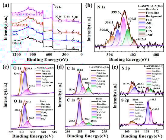 XPS analysis of Q235B steel surfaces immersed in 0.5 M H2SO4 at 300 K for 48 h, comparing uninhibited and 2.0 g·L−1 L-ASPME/GA hybrid (2:3 mol ratio)- inhibited conditions: (a) Full survey spectra, (b–e) High-resolution spectra of (b) N 1s, (c) O 1s, (d) C 1s, and (e) S 2p.
