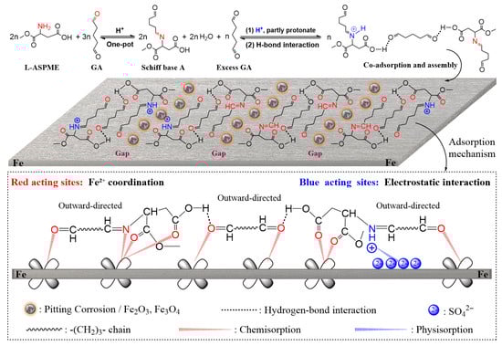 The L-ASPME/GA hybrids outperformed the individual components, exhibiting superior Langmuir adsorption (higher R2, Table 1), concurrent suppression of general and pitting corrosion (Figure 5e), and >90.0% inhibition efficiencies across the verified ratios (2:3–4:1) and concentrations (2.0–4.0 g·L−1, Figure 3a). The synergistic inhibition observed in the L-ASPME/GA hybrid stems from the mixed co-adsorption of its components, leading to the formation of more compactly oriented protective films. This assembly process is primarily driven by spatially synergistic interactions, including hydrogen-bonding networks [28], Fe2+ coordination [9,24,26], and electrostatic interactions [24,33,39]. The resulting oriented films establish micron-confined pathways that effectively block corrosive species from reaching the steel substrate, thereby providing oriented corrosion protection [43]. The hydrogen-bonding networks form mainly between excess components and the Schiff bases within the hybrids [28], while Fe2+ coordination is dominated by the C=N groups of the Schiff base ligands [24] and the O atoms with lone pairs from active aldehyde and carbonyl groups [9,26]. Electrostatic interactions occur primarily between adsorbed negatively charged SO42− ions and protonated C=N groups [24,33,39]. Varying the feed ratios results in differences in the composition of the resulting L-ASPME/GA hybrids and the compactness of their assembled films. Consequently, the corrosion inhibition efficacy of these hybrids against sulfuric acid on carbon steel varied with the feed ratio. Among them, the L-ASPME/GA hybrid with a 2:3 molar ratio exhibited mixed adsorption on the Q235B steel surface (ΔGads = −21.8569 kJ·mol−1; Kads = 6.3939 L·g−1), forming a compactly oriented and thermally robust film with a high energy barrier (Ea = 78.70 kJ·mol−1) against corrosion (Figure 5e). This film provided 90.7% corrosion inhibition efficiency at 300 K and maintained 66.8% at 320 K (Figure 3d), significantly outperforming those formed by individual L-ASPME or GA. The synergistic corrosion inhibition mechanism of this hybrid for Q235B steel in sulfuric acid solution is illustrated in Figure 7.