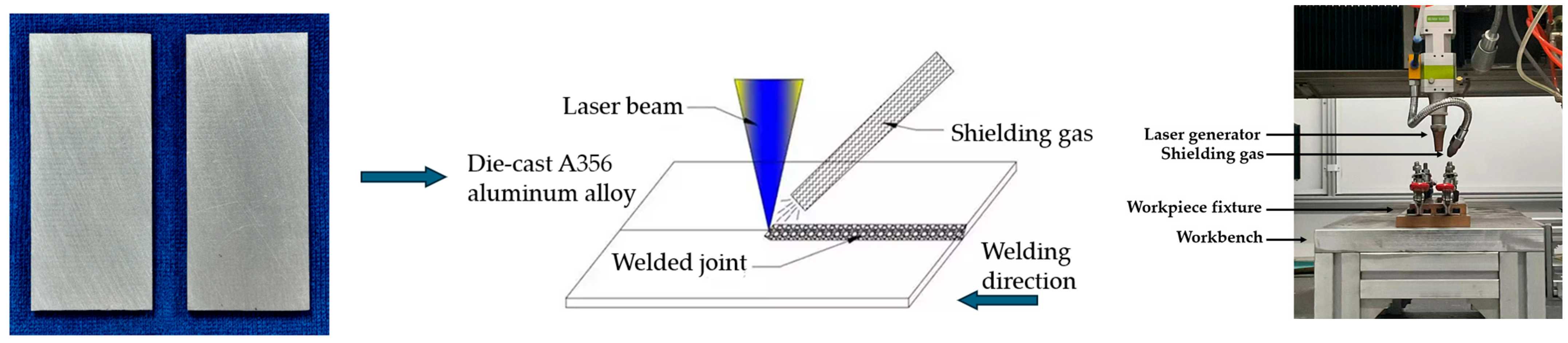 - Zhu, B.W.; Zhu, T.Y.; Liu, J.; Zhuang, B.L.; Yuan, H.W.; Zhang, H.Y.; Pan, H.J.; Liu, E.L. Microstructure and Hardness Analysis of Laser Welded A357 Semisolid Rheocasting Alloy. J. Mater. Eng. Perform. 2025. [Google Scholar] [CrossRef]