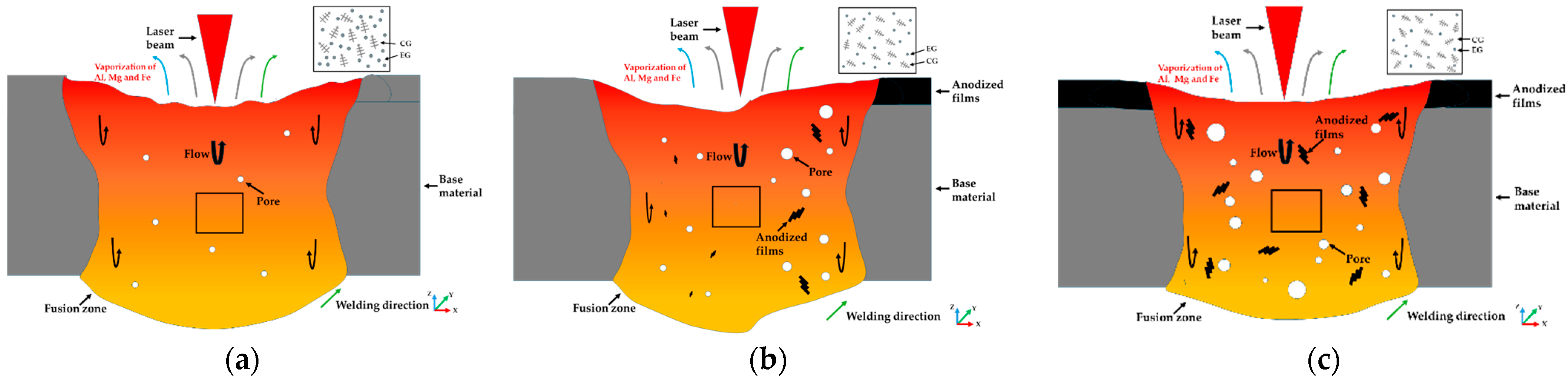 - Trometer, N.; Chen, B.W.; Moodispow, M.; Cai, W.; Rinker, T.; Kamat, S.; Velasco, Z.; Luo, A.A. Modeling and validation of hydrogen porosity formation in aluminum laser welding. J. Manuf. Process. 2024, 124, 877–890. [Google Scholar] [CrossRef]