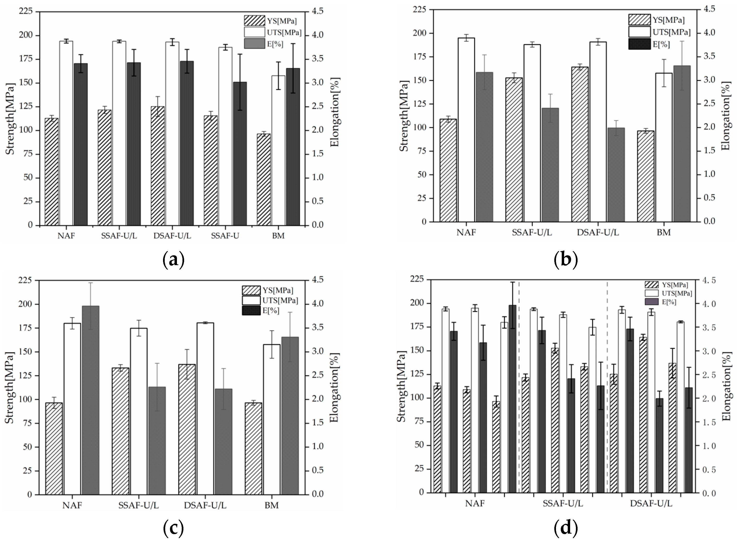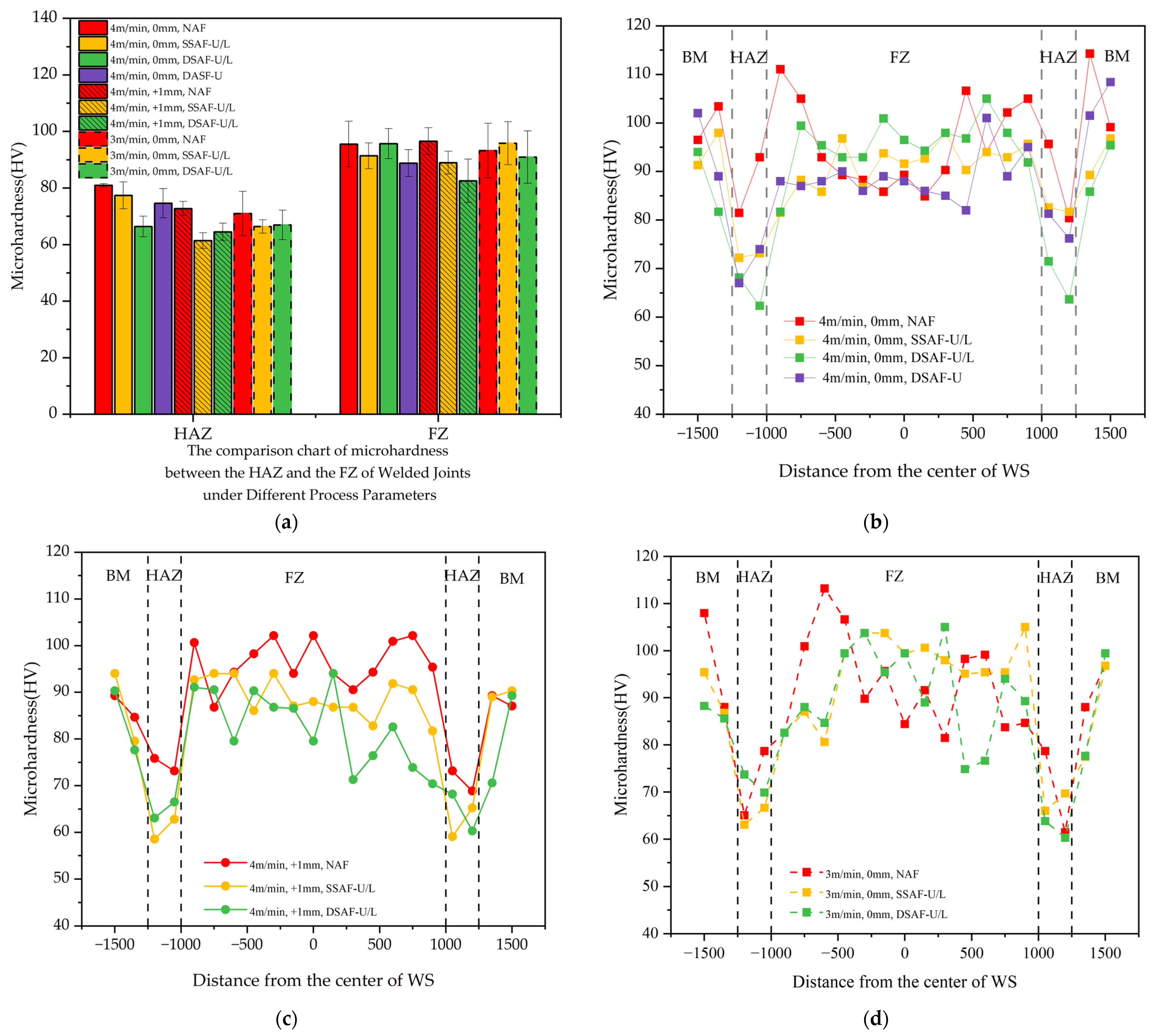 - Anodizing fundamentally governs elemental redistribution and oxygen incorporation in the weld seam. Anodized films increase oxygen content by 10%–15%, with DSAF samples exhibiting the highest oxygen content at 1.31 wt%, compared to 0.78 wt% in NAF samples, as shown in Figure 11. While welding parameters exert limited influence on major alloying elements but strongly regulate oxygen behavior through their effects on melt-pool dynamics and atmospheric interaction.