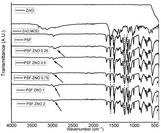 Figure 2 shows the FTIR spectra of ZnO, ZnO MOD, pure polysulfone polymer, and nanocomposites obtained by solution mixing. In pure ZnO, only one signal could be observed at 492 cm−1, corresponding to the Zn-O bond signal [17].
