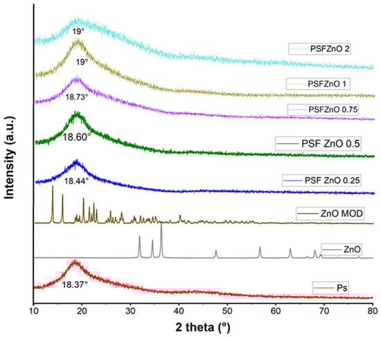 The film structures were studied by XRD, wherein in Figure 4, the diffractograms of the pristine polysulfone are observed, where only one amorphous peak centered at 18.37° is observed, which agrees with the literature [17,32]. Unmodified ZnO exhibits three peaks characteristic of the structure [33]. On the other hand, the modified ZnO presents more peaks due to the presence of the functional groups of L-serine. It is also observed that the intensity of the characteristic peaks of ZnO decreases; this is due to the greater presence of l-serine on the surface of ZnO, which has already been reported for modifications using citric acid [18]. In the ZnOMOD sample, the peaks corresponding to the structure wurtzite ZnO are displaced to 30°, 31.8°, and 32.5°. This may be due to the chemical modification with L-serine; in addition, the characteristic peak of L-serine is observed at 22.8°, and other signals in the XRD that range from 10° to 20° can probably be attributed to the peptide bonds formed between the amino acids.