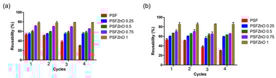 One way to contribute to the environment is to apply the reduction in the amount of waste, which can be accomplished by the three R’s: “Reduce, Reuse, Recycle.” The adsorbent can be reused after desorption. These films can be reused up to 4 consecutive cycles. Generally, a solvent is used against a saturated adsorbent, which causes it to release the adsorbed pollutant. In the case of the films, a wash with deionized water was used, followed by a mild acid, such as citric acid. Figure 11a,b show the reusability percentages for indigo and crystal violet, respectively. In the case of polysulfone ordered from cycle 3, a decrease in the initial removal percentage is observed in both dyes, whereas in the PSFZNO films at different concentrations, this does not decrease; therefore, it is a material that can be reused.