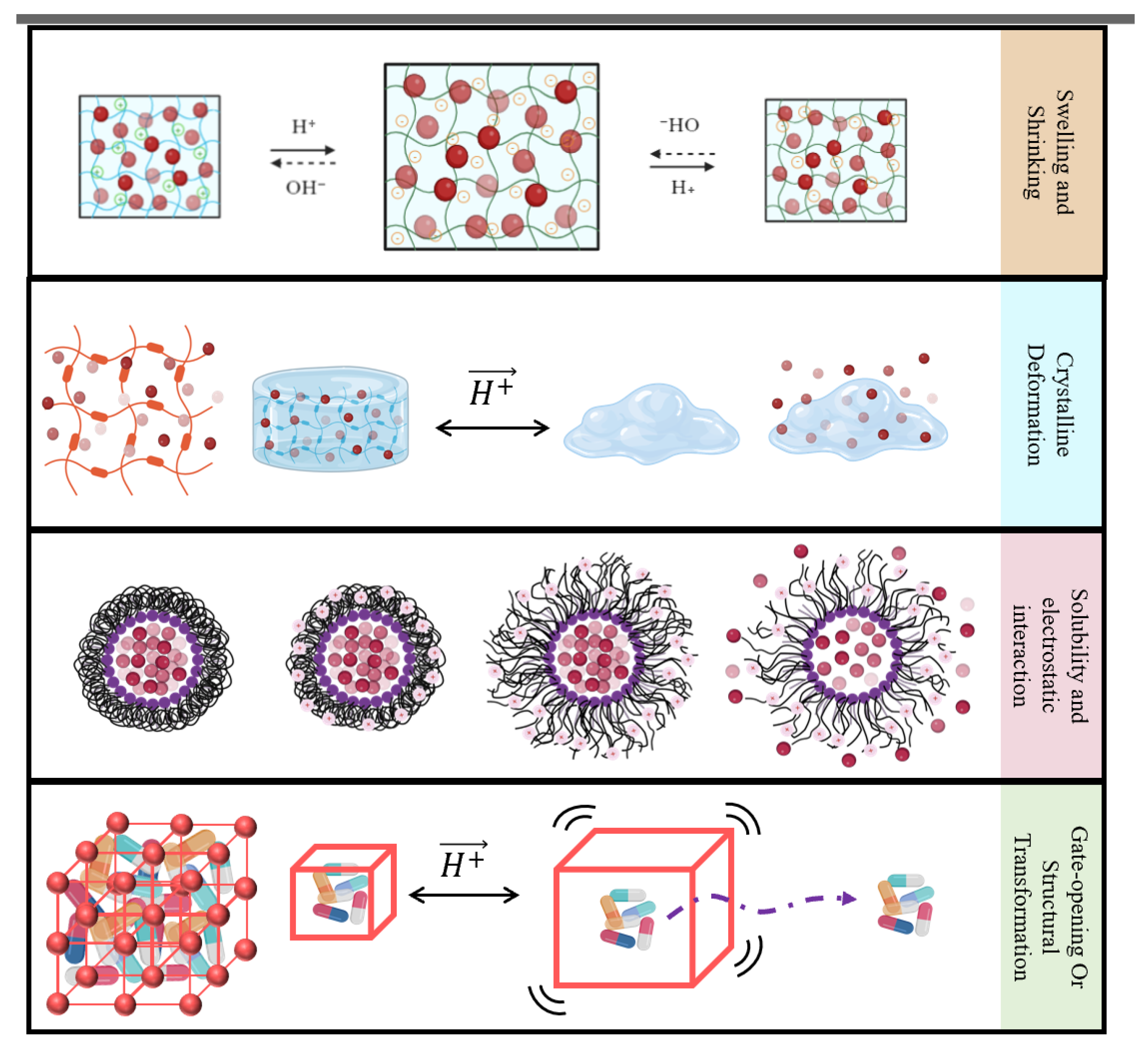 pH-sensitivity mechanisms. First row: swelling or shrinking of a coating compound due to absorption of H+ ions, which have formed the acidic environment. This would allow the drug to be released from the bonds. Second row: some materials form a sort of solid-like structure, like hydrogels, in their neutral form. However, in the presence of H+ ions, their bonds detach, and the material may lose the structure holding the drug. This helps drug release. Third row: H+ ions in an acidic environment can encourage a micelle holding the drug to dissolve and release the anti-bacterial agent. Fourth row: the antibacterial agents trapped in units of an organized structure or pores of a porous compound can be released if the structure changes form, e.g., the bond length increases, or if the gates protecting the pores open up, e.g., the coating around the solid porous particles dissolves.