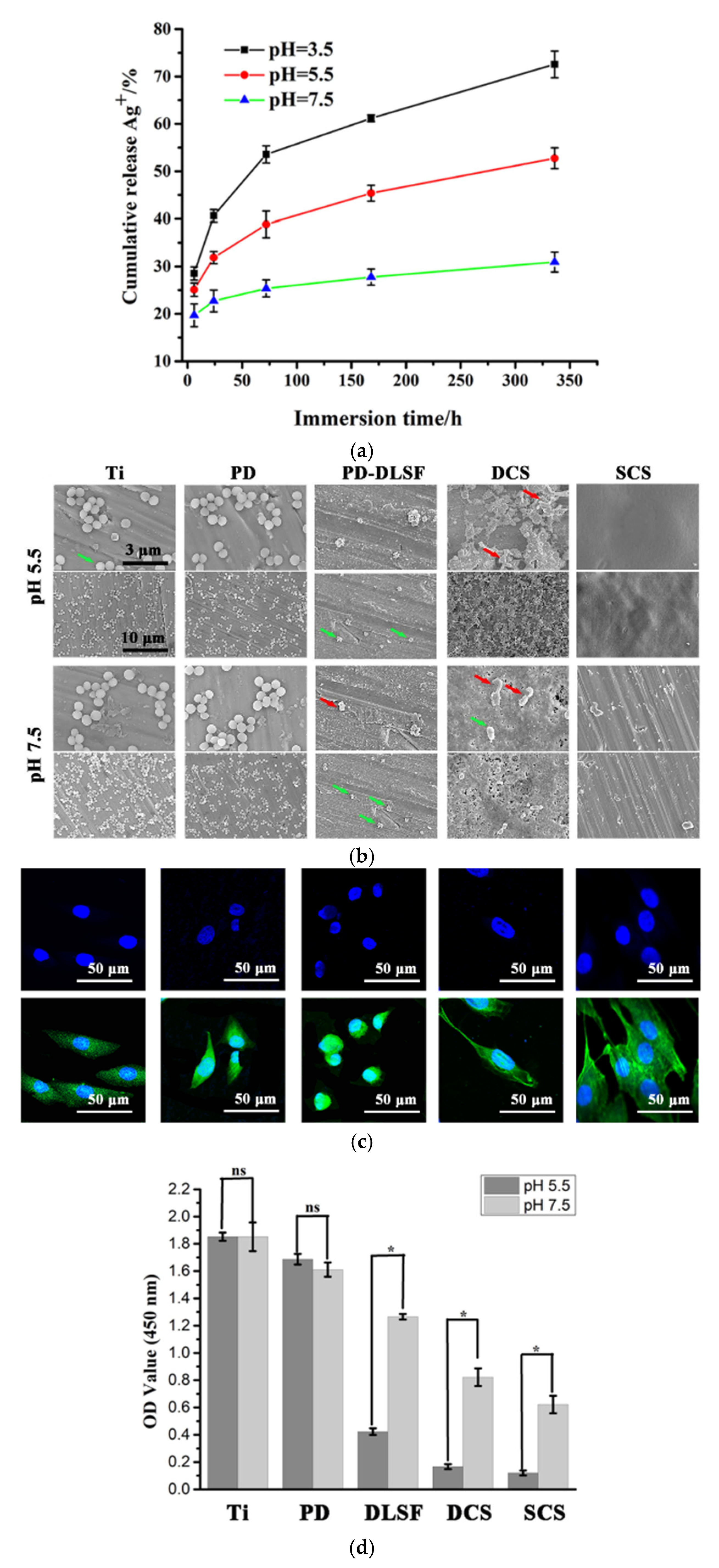 (a) Release behavior of silver in spin-coated surface, (b) SEM images representing S. aureus attachment to the coating after 24 h incubation (green arrows = intact bacteria, red arrows = lesions and distortions on the cells’ membrane), (c) cell staining of the coating, green = cytoskeletal actin fibers, blue = nuclei, (d) killing efficiencies over different substrates; pristine titanium (Ti), PD-modified Ti (PD), SF-coated Ti (DLSF), Dip-Coated Substrate (DCS), Spin-Coated Substrate (SCS) (* shows that the difference between two data columns is statistically significant with p ≤ 0.05, and “ns” shows that there is no statistically significant difference) [50].