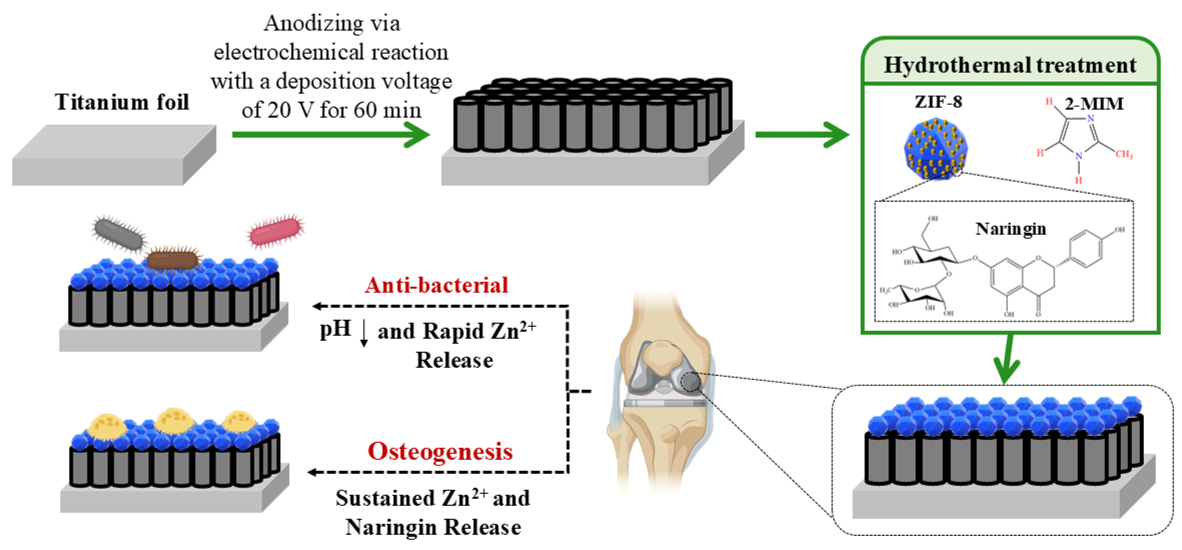 A schematic illustration of titania nanotubes (TNTs) preparation using anodizing, and deposition of naringin-loaded ZIF-8 nanoparticles (ZIF-8@Nar) onto TNT substrates (TNT-ZIF-8@Nar) by means of the hydrothermal method. These TNT-ZIF-8@Nar coatings have two main advantages as an implant coating. (1) Its excellent pH-responsiveness of Zn2+ and the timely release of naringin showing high antibacterial abilities against both E. coli and S. aureus in vitro. and (2) remarkable osteogenesis behavior increasing adhesion, proliferation, differentiation, and expression of osteogenesis-related genes of the osteoblasts (sketched in biorender.com from ref. [107]).