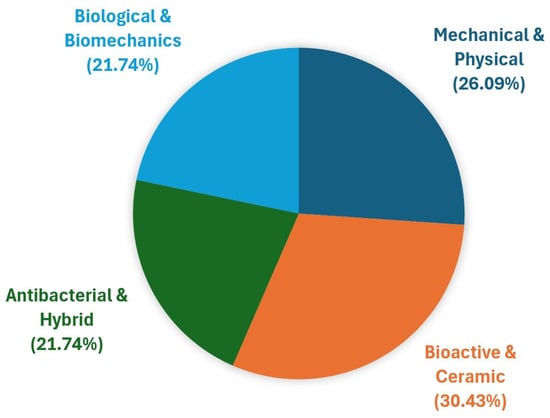 Distribution of the 23 original research articles published across the two-volume Special Issue according to four scientific categories: (i) mechanical and physical surface treatments (n = 6); (ii) bioactive and ceramic-based coatings (n = 7); (iii) antibacterial and multifunctional hybrid surfaces (n = 5); and (iv) biological response, biomechanics, and implant–tissue interface studies (n = 5).
