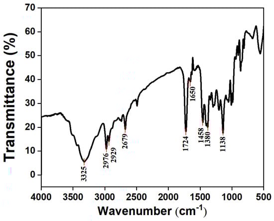 The FTIR spectrum of the acryloyl chloride-modified triisopropanolamine derivative (Figure 2) exhibits characteristic absorption bands at 3325 cm−1, corresponding to O–H stretching, and at 2976 cm−1 and 2929 cm−1, which are ascribed to the asymmetric stretching vibrations of CH3 and CH2 groups within the isopropyl chain. A strong peak at 1724 cm−1 represents the C=O vibration, while the band at 1650 cm−1 is assigned to C=C stretching. Additional absorptions at 1458 cm−1 and 1380 cm−1 arise from CH2 bending and CH3 symmetric deformation, respectively. The peak at 1138 cm−1 attributes to the C–O vibration.