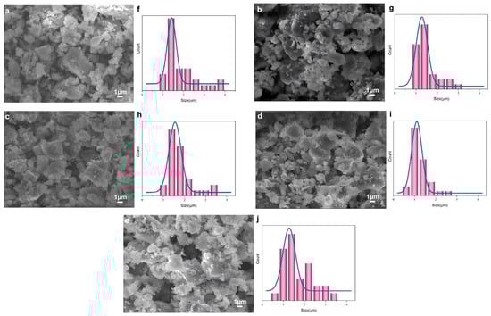 SEM images and corresponding particle size distribution histograms of cement samples: (a,f) blank cement; (b,g) C-GA1; (c,h) C-GA2; (d,i) C-GA3; (e,j) C-GA4.