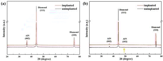 Figure 1 presents the XRD patterns of AlN and pre-doped ScAlN thin films before and after Sc implantation. Both films retained a (002) preferred orientation after implantation, with no detectable diffraction peaks corresponding to secondary phases such as zinc-blende AlN or Sc-based compounds. The position of the AlN (002) peak remained unchanged, suggesting that ion implantation under the current parameters did not induce significant lattice expansion/contraction or phase transitions in the underlying wurtzite structure. A very weak diffraction peak, possibly corresponding to the AlN (102) plane, was observed in the Sc-implanted ScAlN sample (indicated by the arrow in Figure 1b). This suggests minimal alteration of the overall films. Ion implantation primarily modifies a thin surface layer. However, due to the deep penetration depth of X-rays, the XRD patterns are dominated by strong diffraction from the diamond substrate and the bulk of the film. Since XRD signals represent a volume-averaged structural information, the technique is relatively insensitive to localized structural changes in shallow surface regions [19,20]. Therefore, complementary analysis using surface-sensitive techniques is necessary.