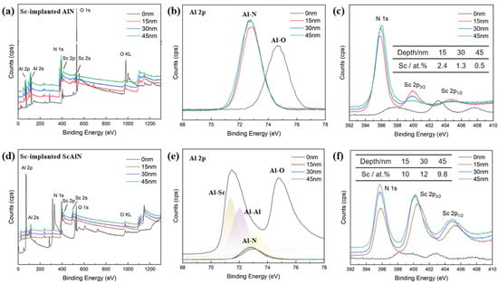 XPS survey spectra of (a–c) Sc-implanted AlN and (d–f) Sc-implanted ScAlN thin films at relative etching depths of 0 nm, 15 nm, 30 nm, and 45 nm. The Al-Sc peak, Al-Al peak, and Al-N peak in (e) are fitted, divided by different colors. The embedded tables in (c,f) refer to the atomic ratio of Sc, quantified by peak area.