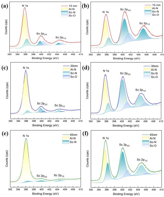 N 1S and Sc 2p core level spectra of (a,c,e) Sc-implanted AlN and (b,d,f) Sc-implanted ScAlN thin films at relative etching depths of 15 nm, 30 nm and 45 nm.