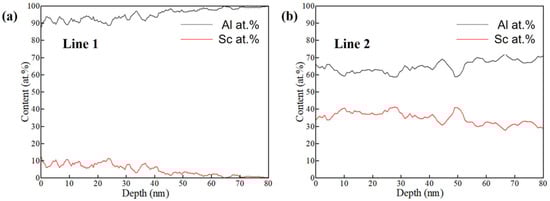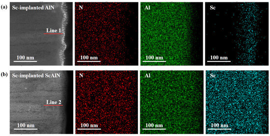 Cross-sectional specimens of the two Sc-implanted thin films were prepared using FIB and characterized by TEM and EDS to determine elemental distribution. EDS mapping images from surface regions (within ~200 nm depth) of both samples are displayed in Figure 4. In Sc-implanted AlN films, the implanted Sc predominantly resides within the 0–50 nm subsurface region (Figure 4a), exhibiting a characteristic Gaussian distribution profile typical of ion implantation processes [27]. Quantitative analysis of the EDS line scans (Figure 5) reveals distinct Sc incorporation characteristics. The average Sc atomic ratio remained below 10 at.% in Sc-implanted AlN films. And the Sc concentration decreases to near-zero levels beyond 70 nm depth. In contrast, for Sc-implanted ScAlN films, the measured Sc atomic ratio increased to above 30 at.%, representing a significant enhancement. It is noteworthy that the discrepancy in Sc concentration values between XPS (~10 at.%) and EDS (>30 at.%) for the Sc-implanted ScAlN film is attributed to their different sampling volumes [28,29]. The XPS quantification reflects the Sc concentration within the top ~5–10 nm, whereas the EDS value averages the concentration over the top ~200 nm. Therefore, above EDS findings demonstrate good consistency with the XPS compositional analysis.