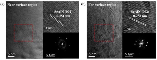 High-resolution TEM was employed to investigate the ion implantation-induced microstructural changes in the Sc-implanted ScAlN film (Figure 6). The most prominent effect is surface amorphization. Within the top ~5 nm (Figure 6a), clear lattice fringes are absent, and the contrast is relatively uniform, indicating a completely amorphized layer. This is a common consequence of ion bombardment due to the displacement of atoms from their lattice sites [30]. No sharp interface exists between this amorphous layer and the crystalline region beneath, suggesting a transition zone. At deeper regions (Figure 6b), the film remains crystalline but contains numerous defects. Localized lattice distortions, interruptions in fringe continuity, and contrast variations are evident. Fast Fourier Transform (FFT) patterns from these regions (insets) confirm crystallinity but with diffuse spots, indicating strain and disorder.