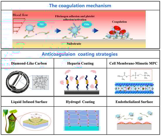 Current mainstream anticoagulant coating technologies primarily follow three design concepts: active anticoagulation strategies, passive anti-adhesion strategies, and endothelialization strategies [4,5]. Active anticoagulation strategies involve immobilizing anticoagulant molecules like heparin or mimicking endothelial cell signaling molecules such as nitric oxide (NO) to directly intervene in the coagulation cascade or platelet activation pathways. Passive anti-adhesion strategies, represented by hydrophilic polyethylene glycol (PEG), zwitterionic polymers, hydrogels, and hydrophobic liquid-infused surfaces, utilize surface hydration layers to create an entropy barrier, steric hindrance, or super-repellent effects, physically blocking protein adsorption. Endothelialization strategies aim to achieve long-term, self-healing anticoagulant function by modifying surfaces with cell-selective peptides or growth factors to guide the directed differentiation and growth of endothelial progenitor cells. It is noteworthy that single strategies often struggle to meet the challenges of the complex in vivo environment [6]; therefore, multifunctional synergistic coatings have become a current research focus.