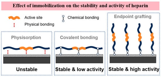 Heparin is a linearly structured anionic polysaccharide containing carboxyl, sulfonic acid, and sulfonamide functional groups. It is a natural anticoagulant substance and the most extensively studied among anticoagulant drugs. Heparin exerts its anticoagulant effect by binding to antithrombin, enhancing its ability to inhibit coagulation proteases such as thrombin and factor Xa [25,26,27]. The efficiency of heparin coatings in preventing non-specific adhesion and thrombin generation depends on the stability of the heparin coating and whether the heparin molecules retain their biological activity after the modification process. Current methods for immobilizing heparin on surfaces primarily include physical adsorption, covalent bonding, and end-point immobilization (Figure 2).