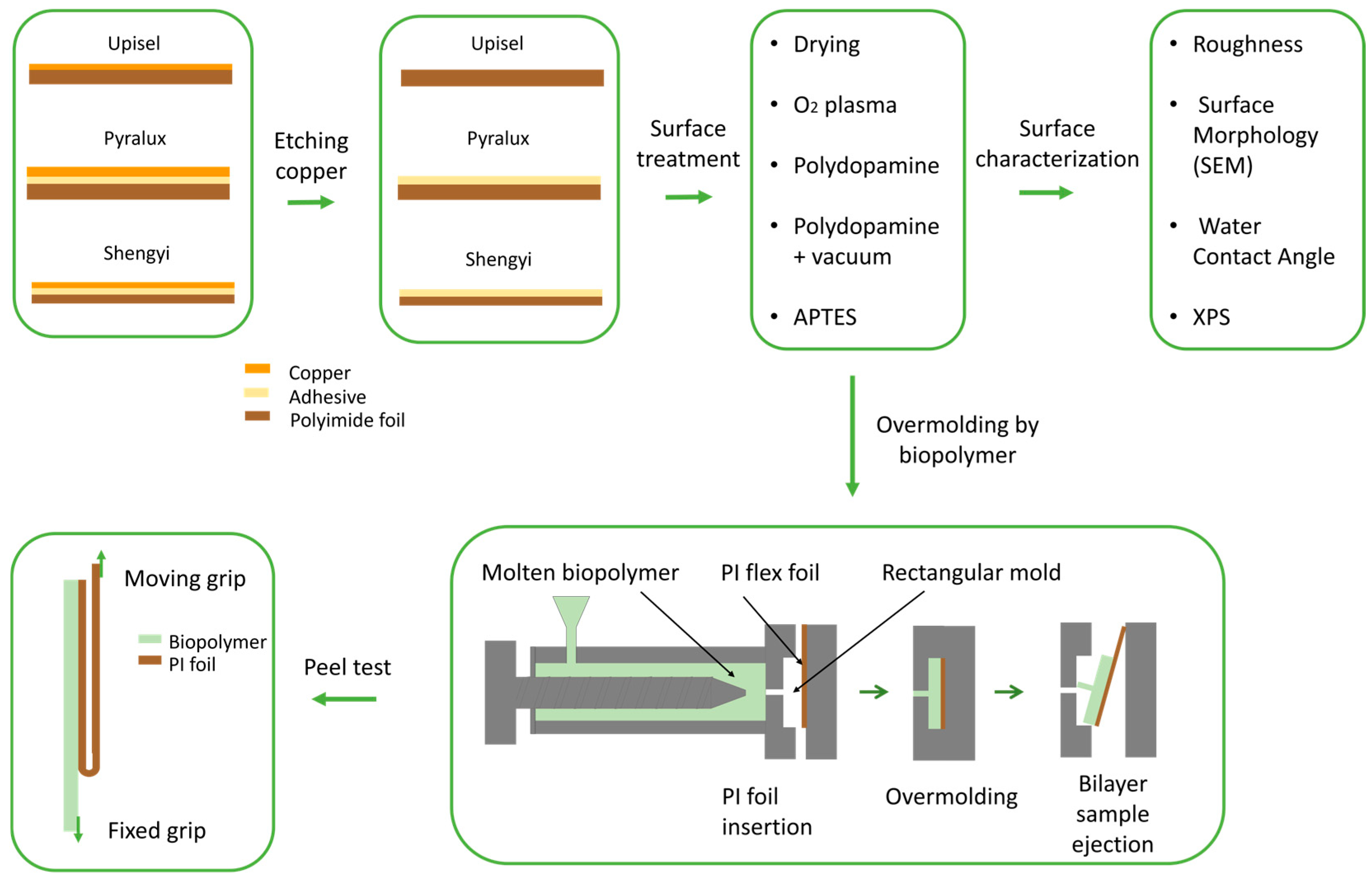 Fazlali, Z.; Schaubroeck, D.; Cauwe, M.; Leus, K.; Morent, R.; De Geyter, N.; Cardon, L.; Bauwens, P.; Vanfleteren, J. Adhesion Improvement Between Cu-Etched Commercial Polyimide/Cu Foils and Biopolymers for Sustainable In-Mold Electronics. Coatings 2025, 15, 1489. https://doi.org/10.3390/coatings15121489