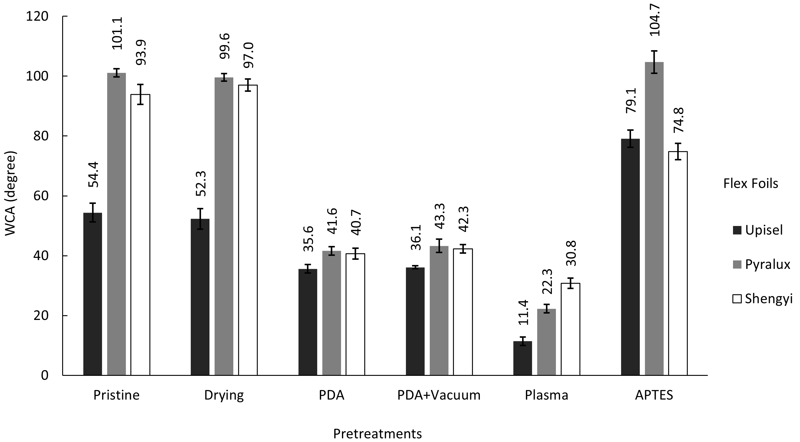 - Cen-Puc, M.; Schander, A.; Vargasgleason, M.G.; Lang, W. An Assessment of Surface Treatments for Adhesion of Polyimide Thin Films. Polymers 2021, 13, 1955. [Google Scholar] [CrossRef]