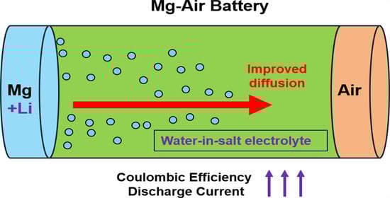 - Wang, H.; Chen, X.; Le, Q.; Zou, Q. Discharge performance of Mg-Al-Cd anode for Mg-air Battery. Mater. Res. Express 2021, 8, 046521. [Google Scholar] [CrossRef]