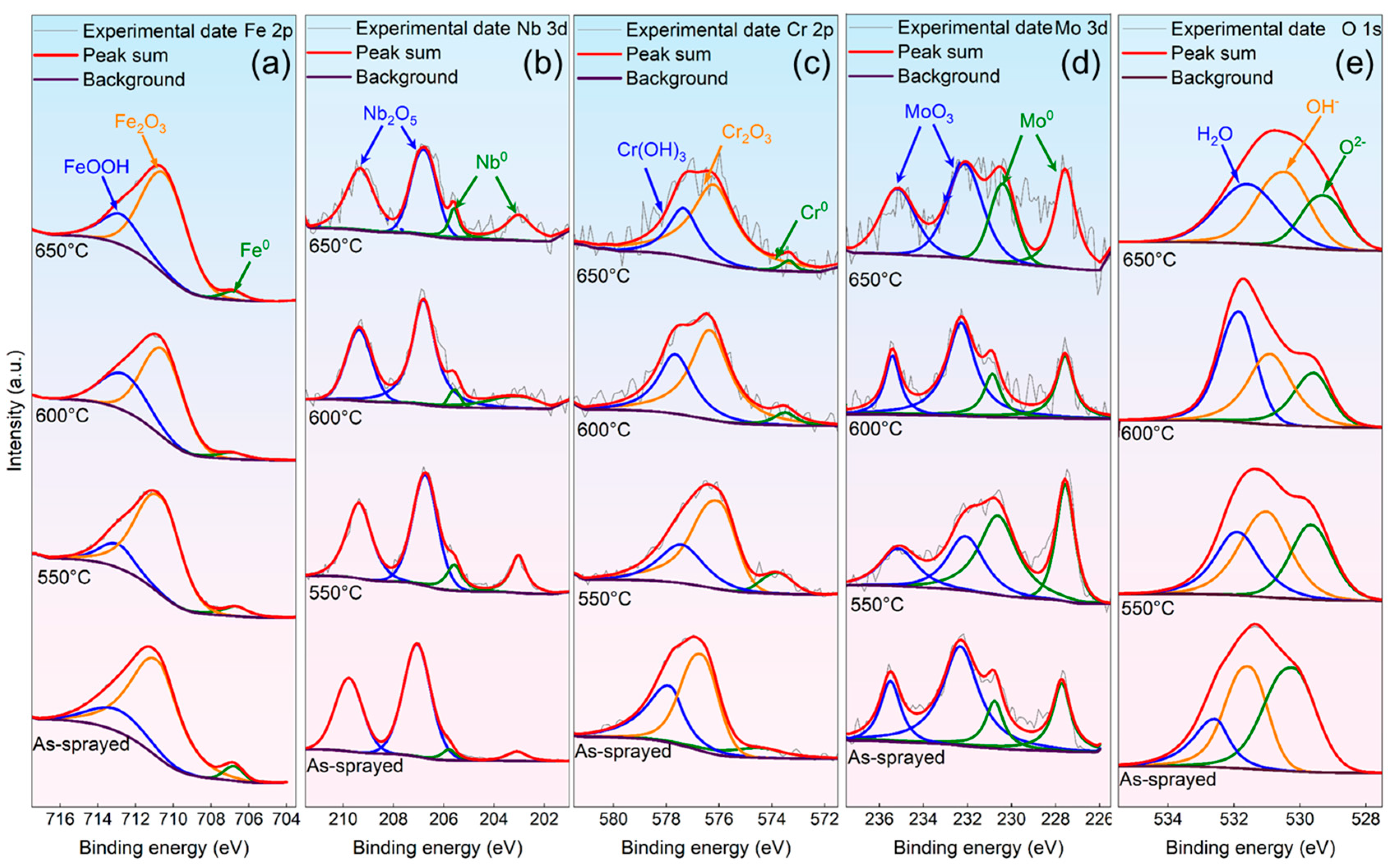 - Ge, Y.Y.; Cheng, J.B.; Xue, L.; Zhang, B.S.; Hong, S.; Liang, X.B.; Wang, S.G.; Zhang, X.C. Pore defect and corrosion behavior of HVAF-sprayed Co21Fe14Ni8Cr16Mo16C15B10 high entropy metallic glass coatings. Corros. Sci. 2025, 242, 112564. [Google Scholar] [CrossRef]