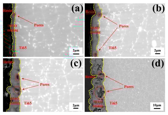 Figure 2. Cross-sectional morphologies of various MAO coatings: (a) MAO-50, (b) MAO-100, (c) MAO-150, and (d) MAO-200.