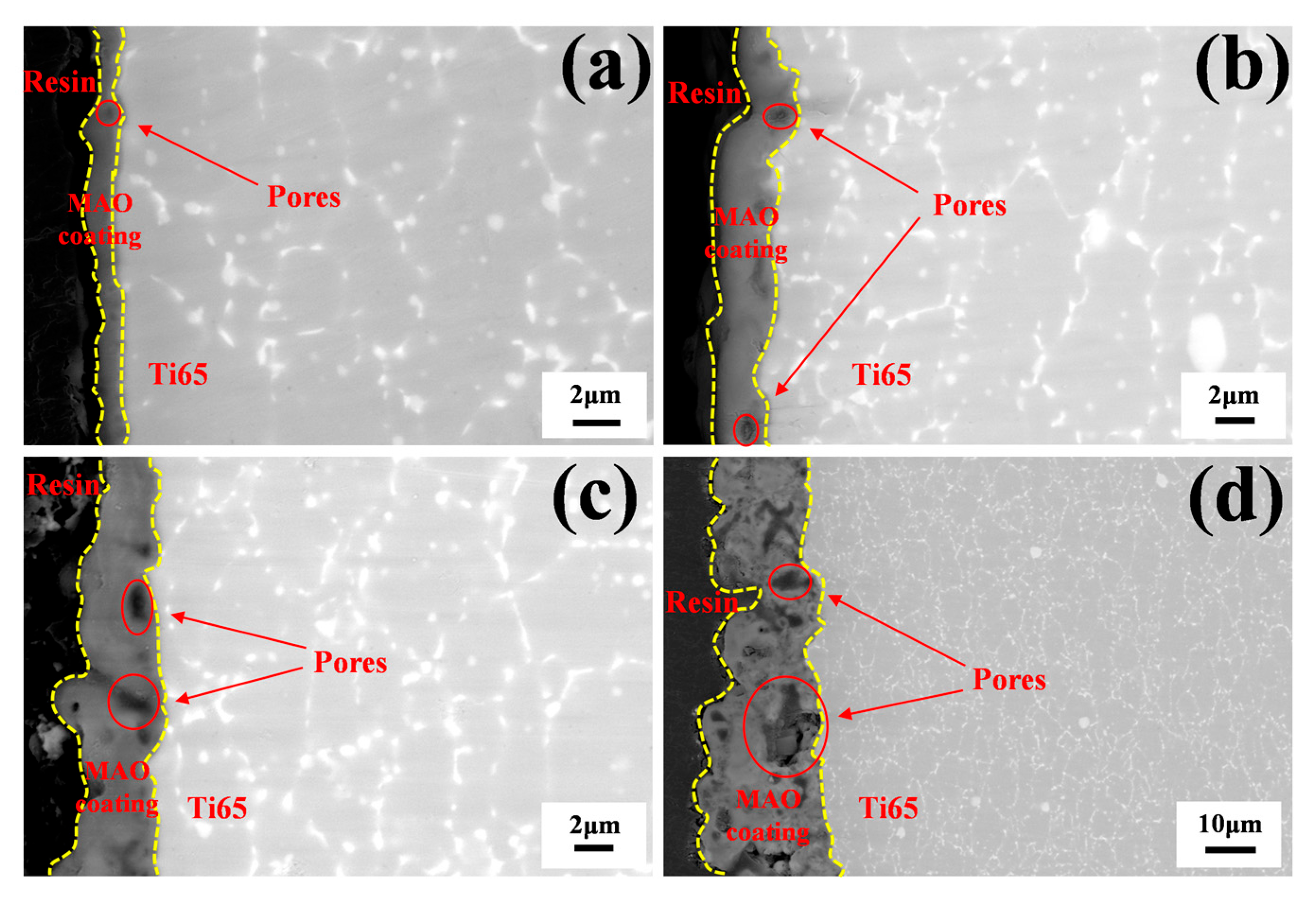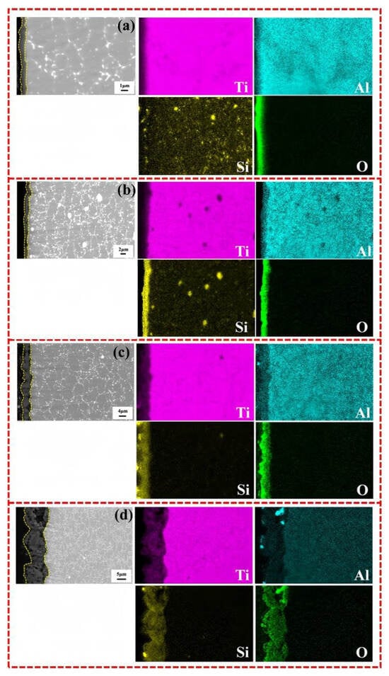 Figure 3 shows the cross-sectional element distribution of various MAO coatings; it can be observed that the coating is enriched with large amounts of Ti, O, and Si elements, as well as a minor portion of Al, which is consistent with the surface EDS spectra data. The Si element in the substrate appears in the form of a Si-rich phase. In Figure 3d, a concentration of Al is observed in the coating, which may be due to the infiltration of Al2O3 alumina particles into the larger pores of the coating during the polishing process.