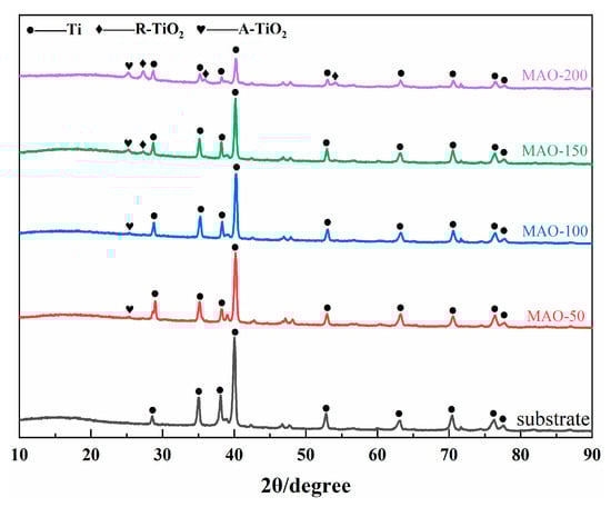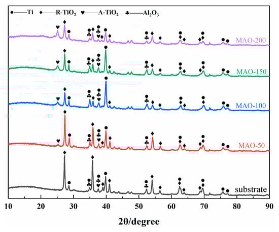 Table 2 shows the average pore size and surface porosity of various MAO coatings prepared under different cathodic voltages. When the cathodic voltage was relatively low, the formation of MAO coatings with micro-sized pores was more likely to occur. Compared with the MAO-50 coating, the MAO-100 coating exhibited a comparable level of surface porosity; however, it featured the smallest pore size. When the cathodic voltage exceeded 100 V, an increase in the cathodic voltage resulted in a corresponding increase in both the pore size and porosity of the MAO coating surface.