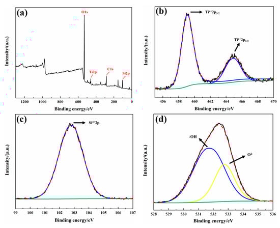 Figure 5. XPS fine-scan profiles of MAO coatings (a) full-spectrum profile; (b) Ti2p; (c) Si2p; (d) O1s.
