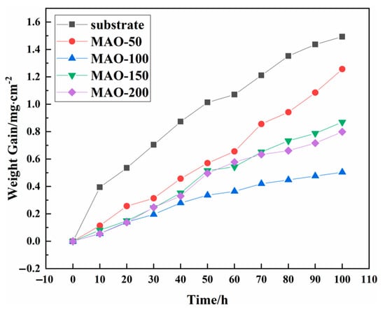 The surface porosity of the MAO-100 coating is the lowest, with small and uniformly distributed pores. During high-temperature oxidation, a newly formed oxide film is relatively evenly distributed at the interface between the substrate and the MAO coating. Concurrently, certain oxide films exhibit outward growth, filling the surface voids of the MAO coating. Once a continuous internal oxide layer is formed, it works in conjunction with the outward-growing oxide films to collectively inhibit the inward diffusion of oxygen. During the cyclic oxidation process at 750 °C, the weight gain curve of the MAO-100 coating initially exhibits a linear relationship, followed by a parabolic-like relationship. This behavior indicates that the MAO-100 coating demonstrates the best resistance to high-temperature cyclic oxidation.