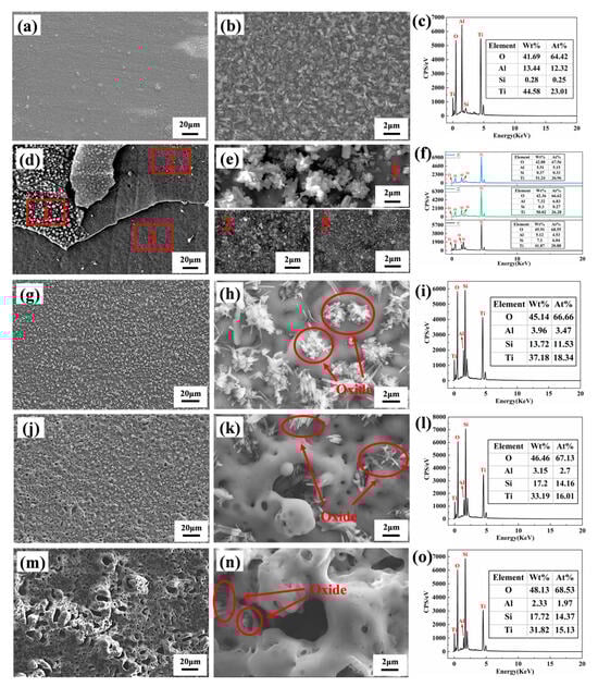 Figure 8. SEM surface morphologies and EDS elements composition of Ti 65 alloy and various MAO coatings after cyclic oxidation at 750 °C: (ac) Ti65 alloy, (df) MAO-50, (gi) MAO-100, (jl) MAO-150, and (mo) MAO-200. The morphologies of samples 1, 2, and 3 in Figure (e) are magnified views corresponding to the labeled positions 1, 2, and 3 in Figure (d), respectively.