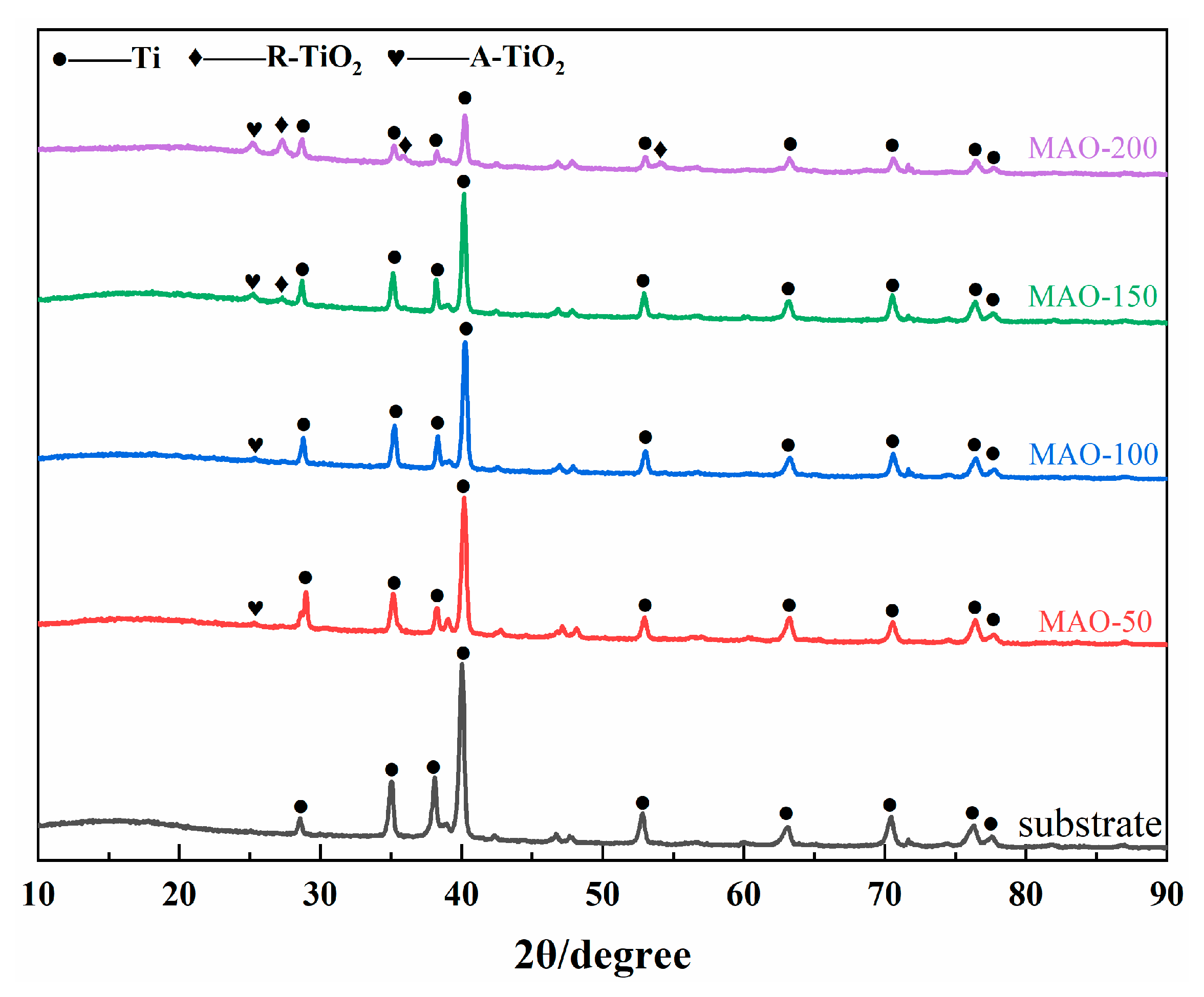 Figure 4 is the XRD phase patterns of the Ti65 substrate and the MAO coatings prepared under different cathodic voltages. It can be observed that the phase of the Ti65 substrate is Ti, and the peak positions of the Ti in the MAO coatings show little change. This is because the MAO coatings are thin, and X-rays penetrate through the coating and hit the substrate, so the peaks mainly correspond to the Ti peaks of the substrate. Additionally, since the MAO coatings are porous, X-rays pass more easily through the voids and strike the substrate. As the cathodic voltage increases, the coating thickness increases, and oxide phases begin to appear. The main oxide phases are rutile TiO2 (R-TiO2) and anatase TiO2 (A-TiO2), confirming that the large amounts of O and Ti detected by EDS are present in the form of oxides.