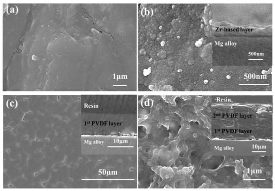 Surface SEM images of AZ31 Mg alloy under different treatment conditions (insets: cross-section of each sample) (a) after cleaning, (b) Zr-treated, (c) 1st PVDF coating, (d) 2nd PVDF coating.