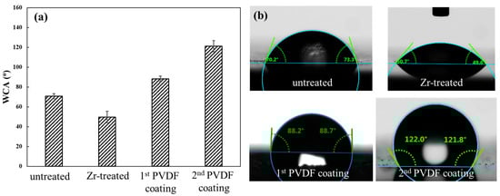 The WCA is a key parameter for evaluating the surface wettability of materials, defined as the angle formed between the tangent of the liquid–vapor interface and the solid–liquid interface when a sessile water droplet is in equilibrium on the solid surface [41,42]. Higher WCA values indicate more hydrophobic surfaces. Since the surface wettability correlates closely with coating corrosion resistance, the WCAs of untreated, Zr-treated, and PVDF-coated substrates were measured to assess the coating’s corrosion-prevention performance, as presented in Figure 3. The WCA of the untreated Mg alloy was measured as 70.7 ± 2.6°, indicating a hydrophilic surface. This hydrophilicity arises from the native oxide layer (composed of MgO and Mg(OH)2) that is inherently rich in surface hydroxyl (-OH) groups.