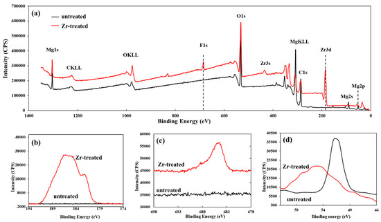 XPS of untreated and Zr-treated samples. (a) full spectrum; (b) Zr 3d; (c) F 1s (d) Mg 2p.