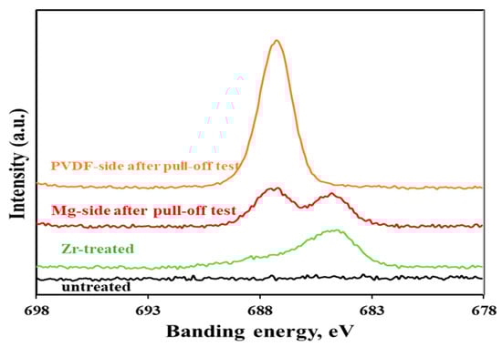F 1s peak in XPS from both the Mg-side and PVDF-side of a sample after pull-off test. (Untreated and Zr-treated samples are also shown for comparison).